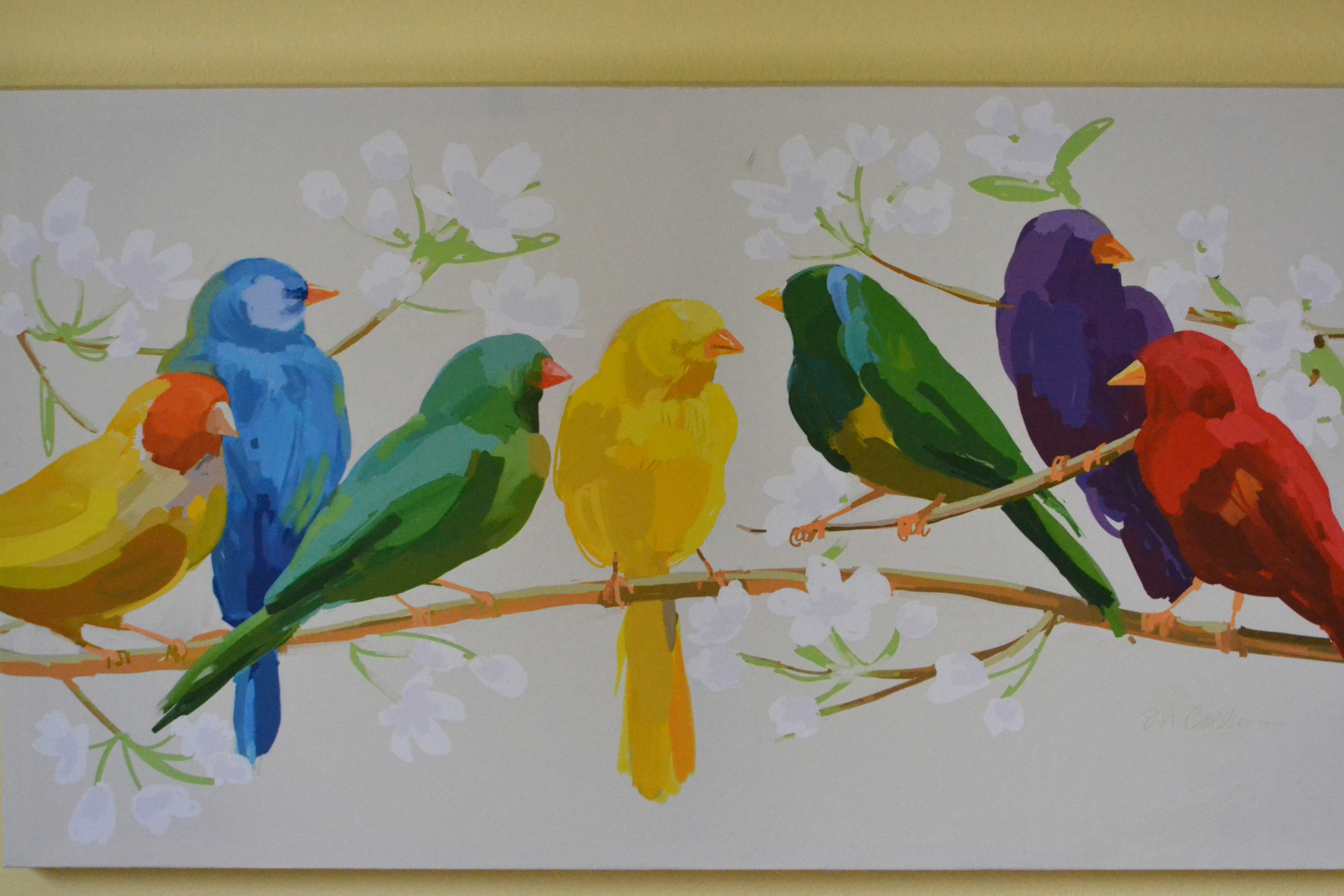 I saw these colorful creatures at The Potter’s House, a local store that sells hand-thrown bowls and plates and mugs. A store perched on the other end of the spectrum from WalMart. My go-to store for gifts. I couldn’t resist the whimsy. Curt calls it, “Till We Have Faces.” I wake up with the birds every morning; they make me sing.