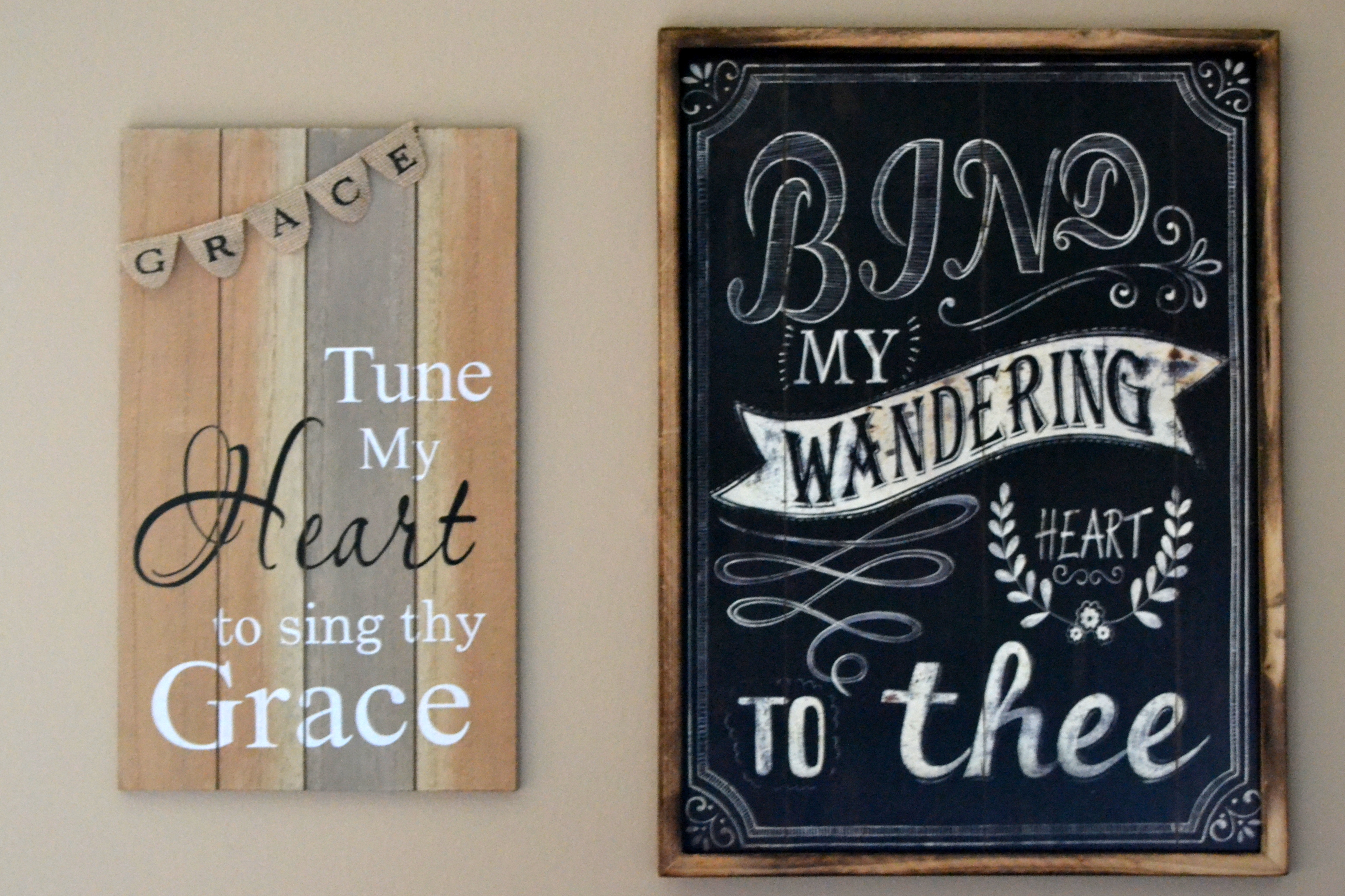 My friend Faith gave me Bind my wandering heart to thee knowing the phrase came from my favorite hymn, Come Thou Fount of Every Blessing. I propped this on top of my piano, testing the location before I pounded a (sacred) nail in the wall. This week I was in the midst of a talkfest in the aisle of a store when Tune my heart leaned into my peripheral vision. And now they both sing to me in my kitchen while I make dinners or type on the computer. I love the pairing.