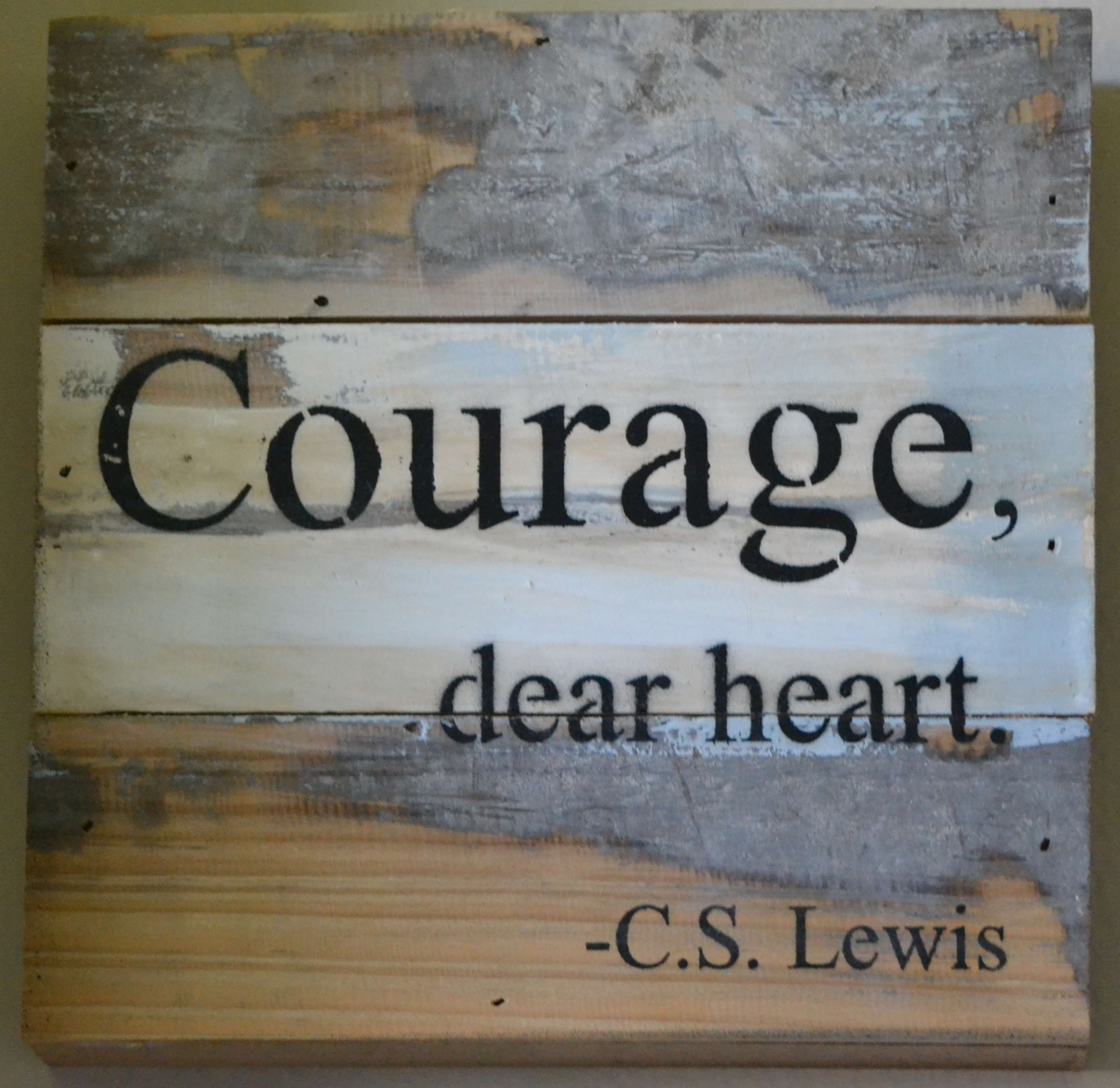 The Courage, dear heart is eye level next to the mirror in the bathroom. Befitting, eh? I love looking at this while I prepare for the day ahead. My husband uses this phrase to gently tease me. As in, (me–>) “I can’t figure out how to get the gray scuff marks out of the sink.” (him–>) “Courage, dear heart.”