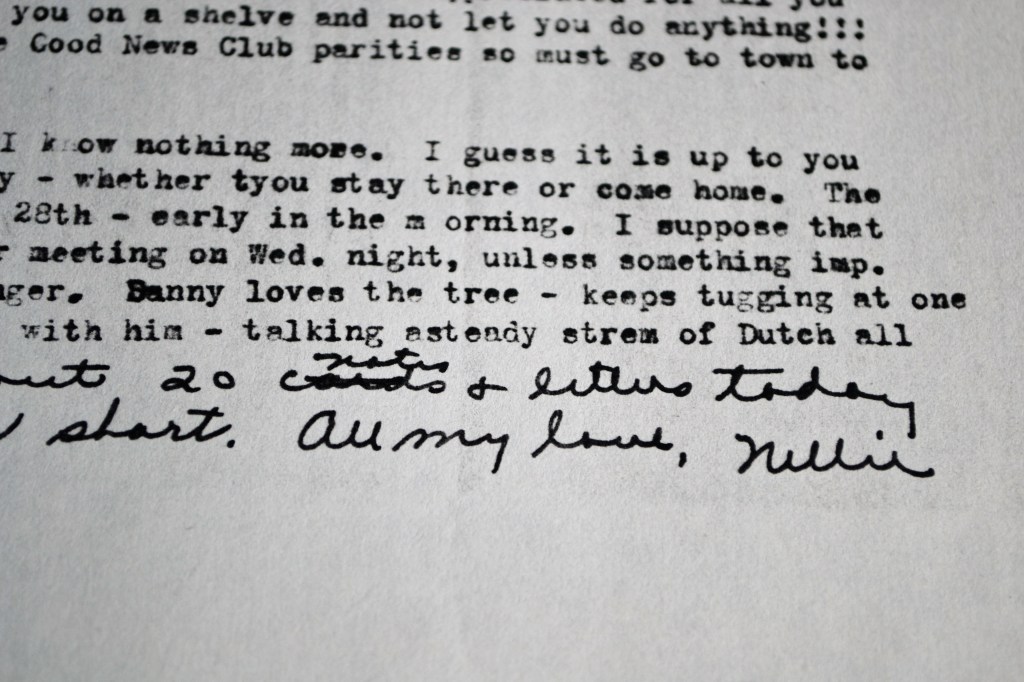 Well, I had better close now. Only five days until you’ll be home. Oh yes, there is a chapel fellowship meeting Saturday night – potluck supper and they gave us a special invitation to come. They are working hard to make it a family affair again – for all the chapel and not the clickish – note the new way of spelling that – way it was started. Wouldn’t that be a good time for you to get with the people to visit with some of them? Potluck supper. I know they would very much appreciate having you there. They seem to sincerely miss you and your influence around here.