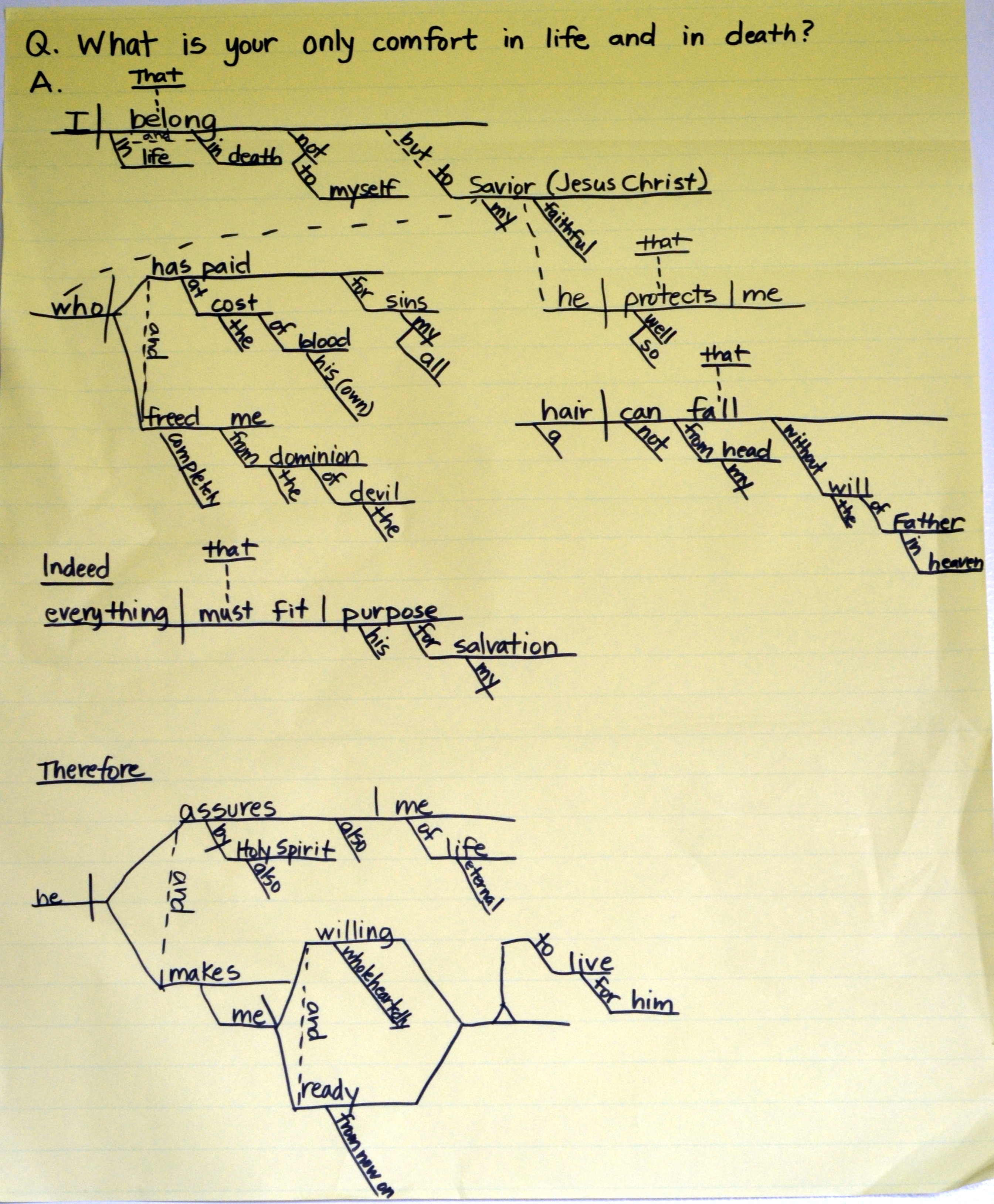 I couldn’t resist trying a long sentence myself. Above is the answer to the first question of the Heidelberg Catechism. Corrections are welcome.